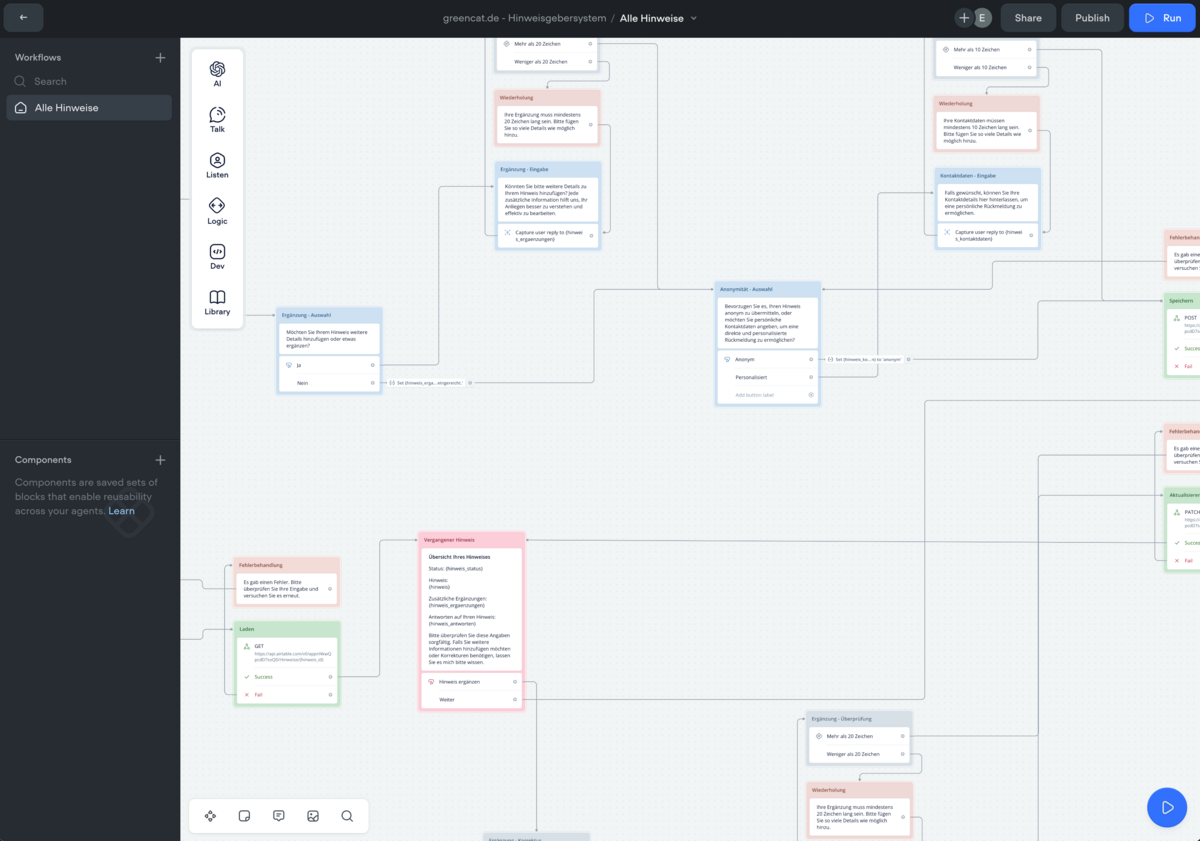 Vom Aufbau des Chatflusses bis hin zur automatisierten Bearbeitung eingehender Hinweise können alle Schritte auf deinen Bedarf zugeschnitten werden. So kann zum Beispiel festgelegt werden, wie Hinweise kategorisiert und weitergeleitet werden, um sicherzustellen, dass die Bearbeitung effizient und strukturiert abläuft.